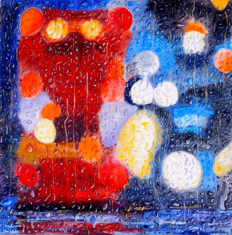 Depicting the London Bus in a London street and lights surrounding it from neighbouring cars and taxis. The rain drops are on the window pane I was looking through. It has a mix of the distortion of the images through the rain and the detailed raindrops on the window pane.